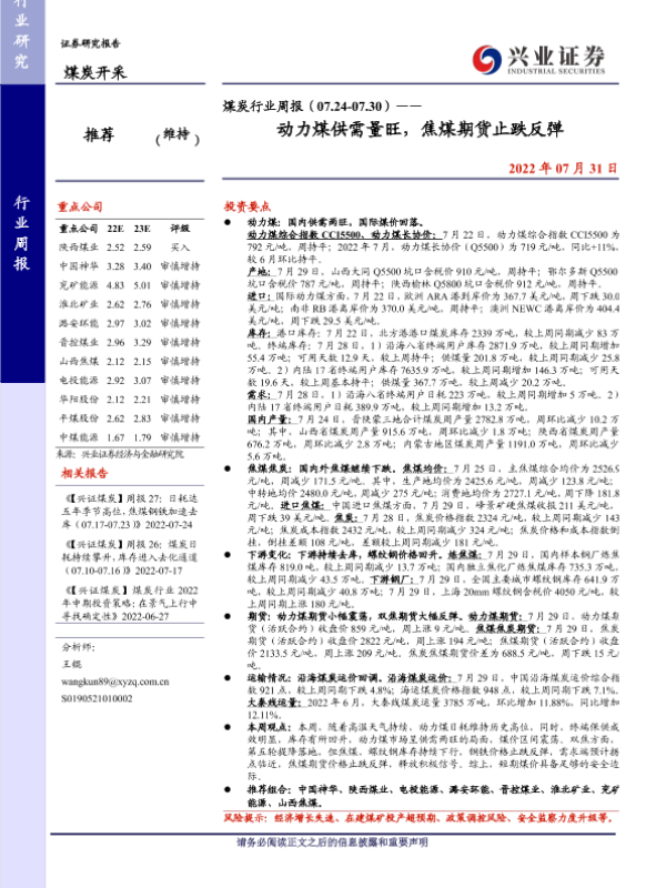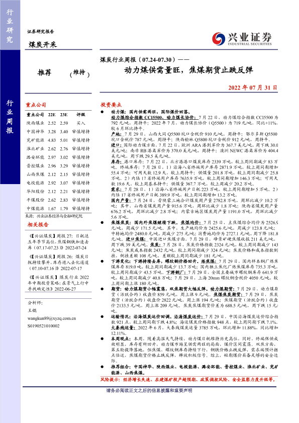 【兴业证券】【20220731】煤炭行业周报(07.24-07.30)——动力煤供需量旺,焦煤期货止跌反弹-12页