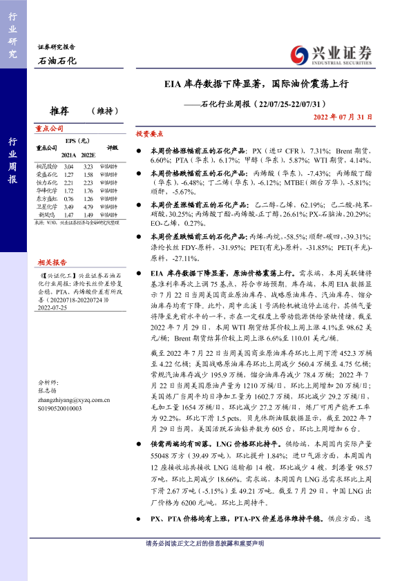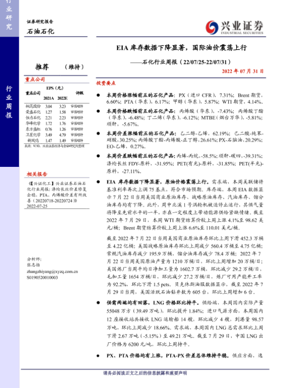 【兴业证券】【20220731】20220731-兴业证券-石化行业周报:EIA库存数据下降显著,国际油价震荡上行-16页