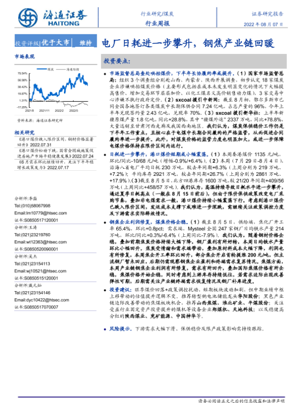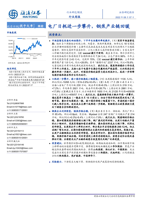 【海通证券】【20220807】20220807-海通证券-煤炭行业周报:电厂日耗进一步攀升,钢焦产业链回暖-2页
