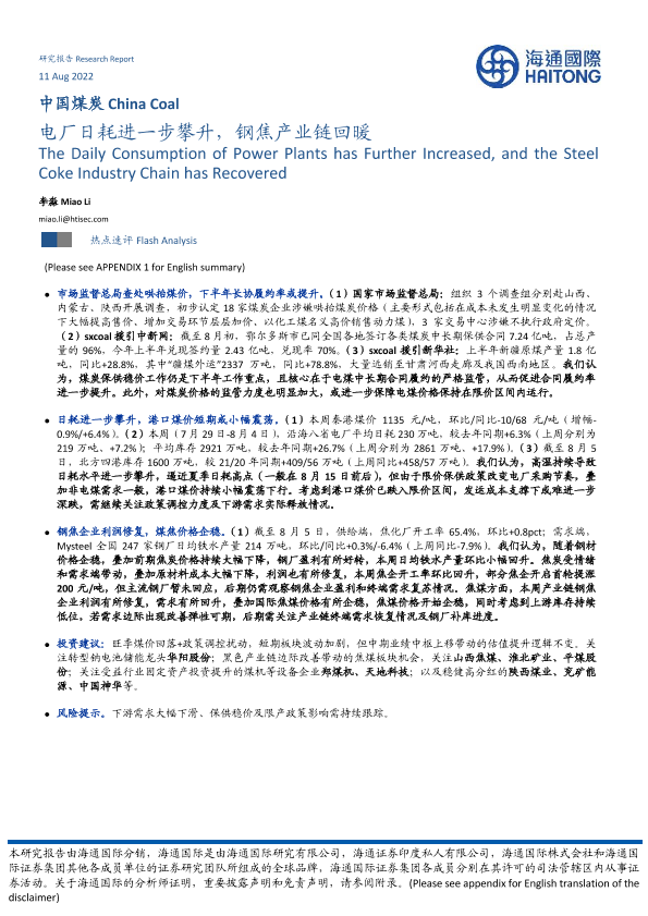 【海通国际】【20220811】中国煤炭:电厂日耗进一步攀升,钢焦产业链回暖-9页
