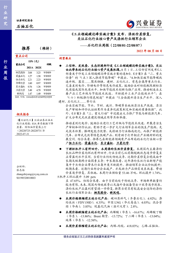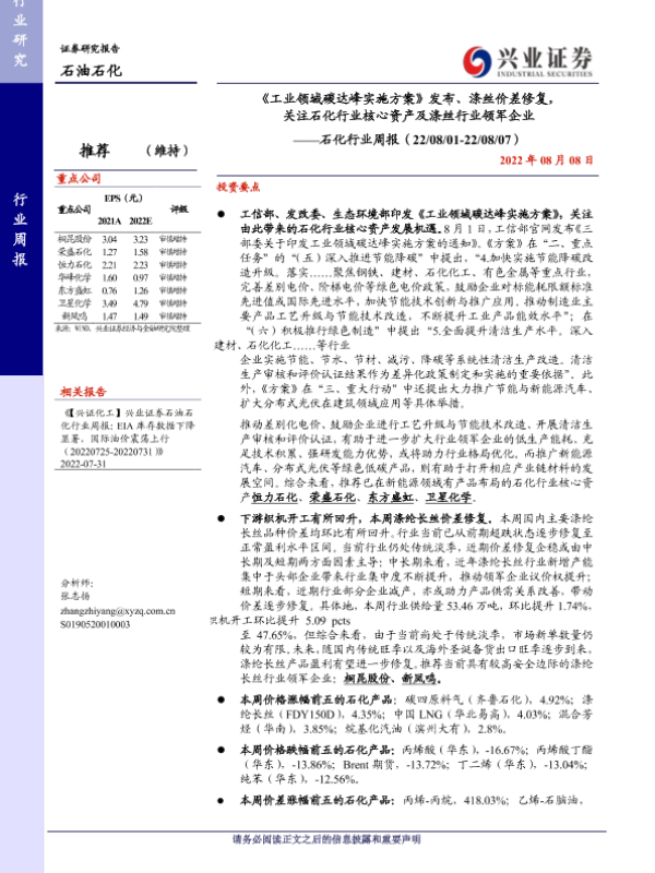 【兴业证券】【20220808】石化行业周报:《工业领域碳达峰实施方案》发布、涤丝价差修复,关注石化行业核心资产及涤丝行业领军企业-16页