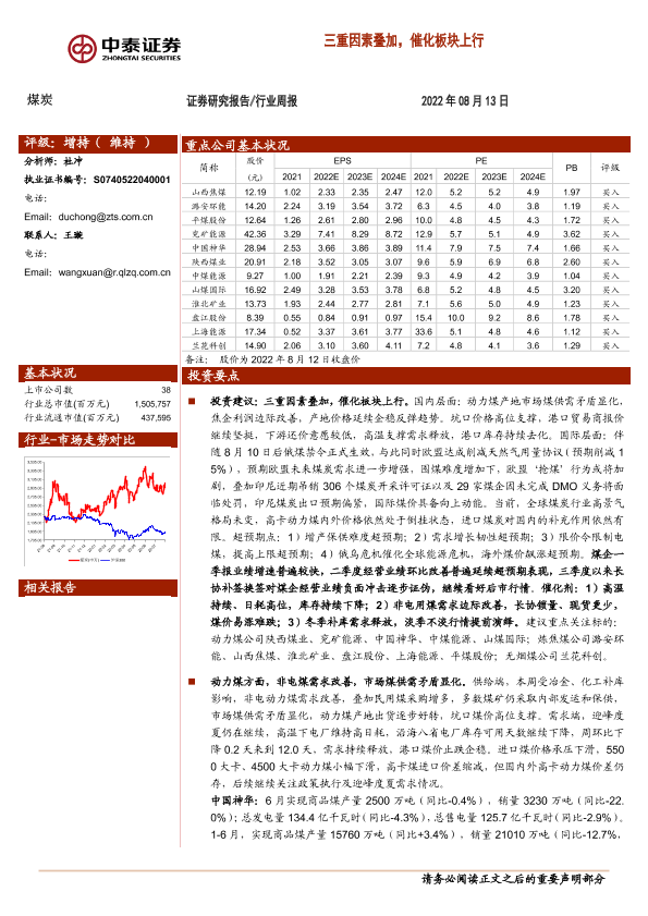 【中泰证券】【20220813】中泰证券-煤炭行业周报:三重因素叠加,催化板块上行-24页