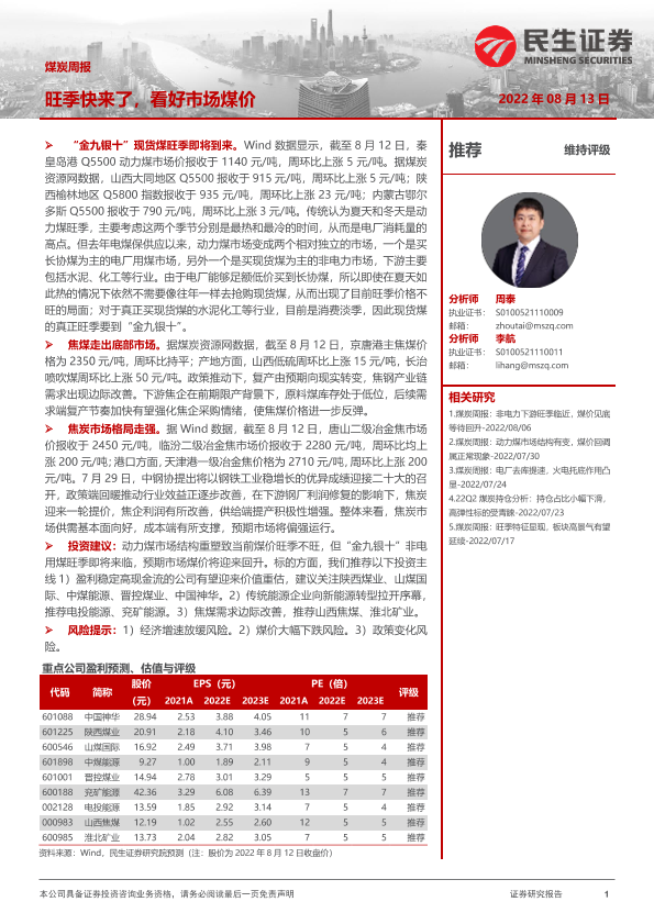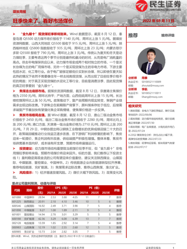 【民生证券】【20220813】20220813-民生证券-煤炭周报:旺季快来了,看好市场煤价-21页
