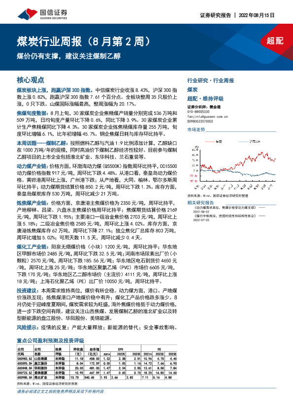 【国信证券】【20220815】煤炭行业周报(8月第2周):煤价仍有支撑,建议关注煤制乙醇-26页