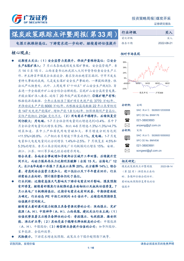 【广发证券】【20220821】煤炭开采:煤炭政策跟踪点评暨周报(第33周)-电煤日耗维持高位,下游需求进一步向好,继续看好估值提升-16页