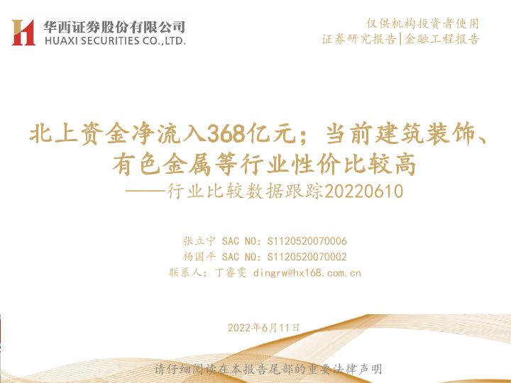 【华西证券】【20220611】行业比较数据跟踪:北上资金净流入368亿元;当前建筑装饰、有色金属等行业性价比较高-24页