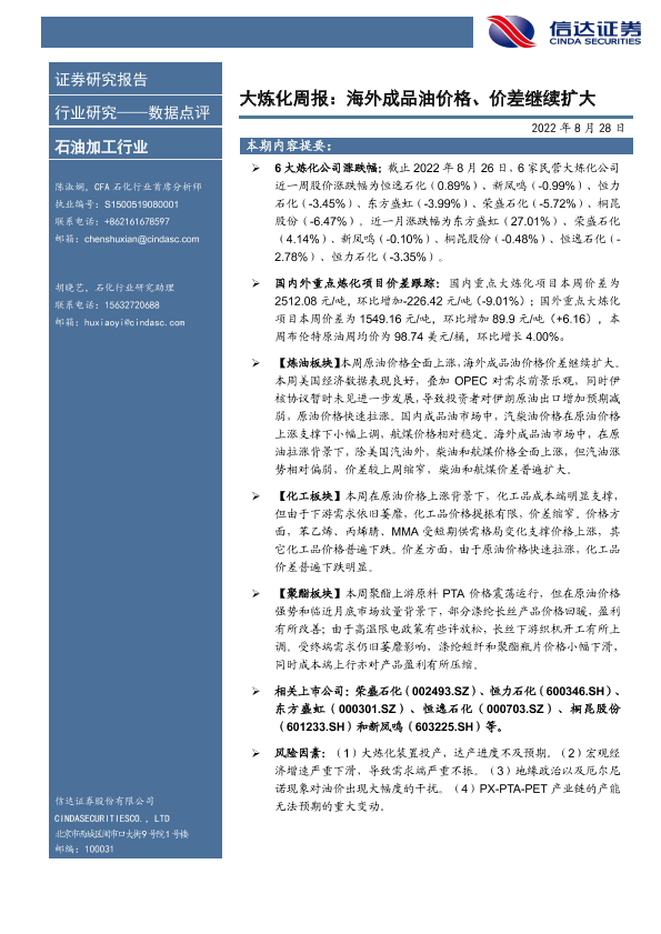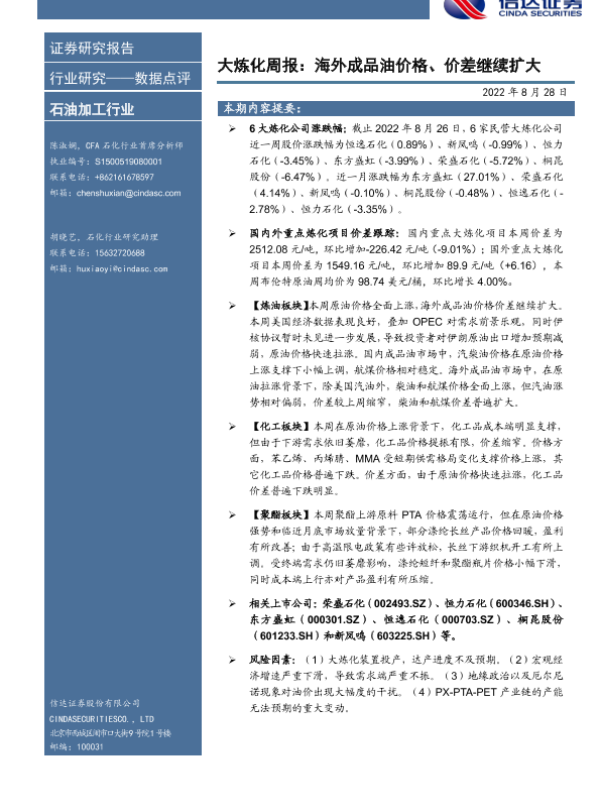 【信达证券】【20220828】大炼化周报:海外成品油价格、价差继续扩大-19页