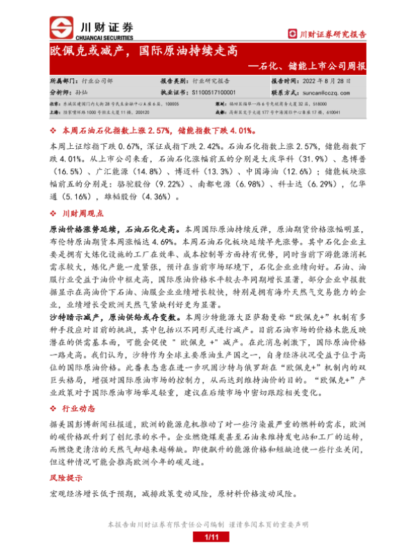 【川财证券】【20220828】20220828-川财证券-石化、储能上市公司周报:欧佩克或减产,国际原油持续走高-11页