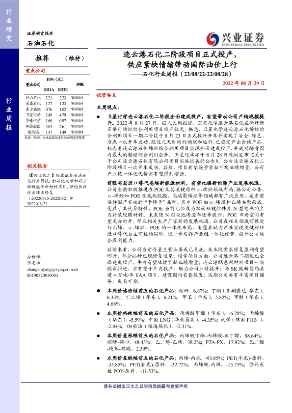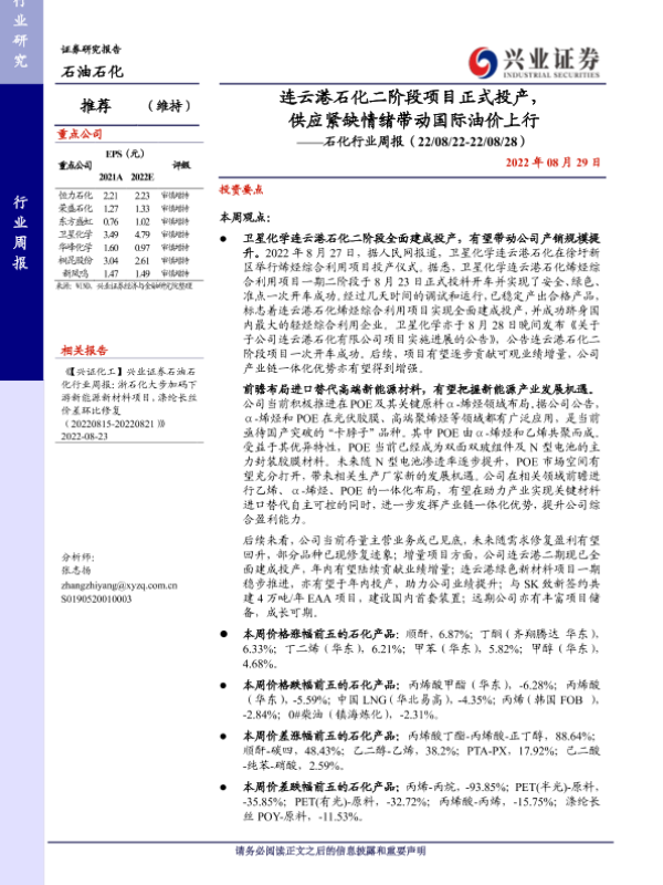 【兴业证券】【20220829】石化行业周报:连云港石化二阶段项目正式投产,供应紧缺情绪带动国际油价上行-17页