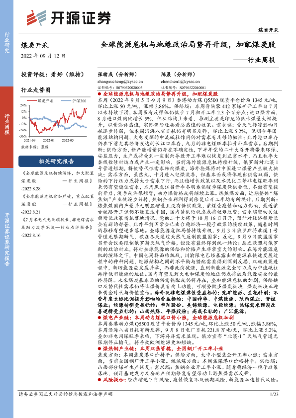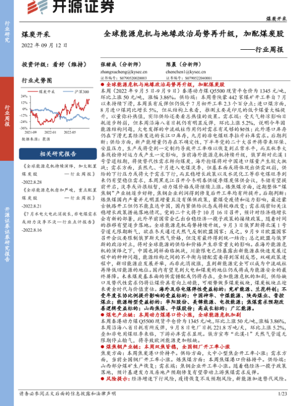 【开源证券】【20220912】煤炭开采行业周报:全球能源危机与地缘政治局势再升级,加配煤炭股-23页