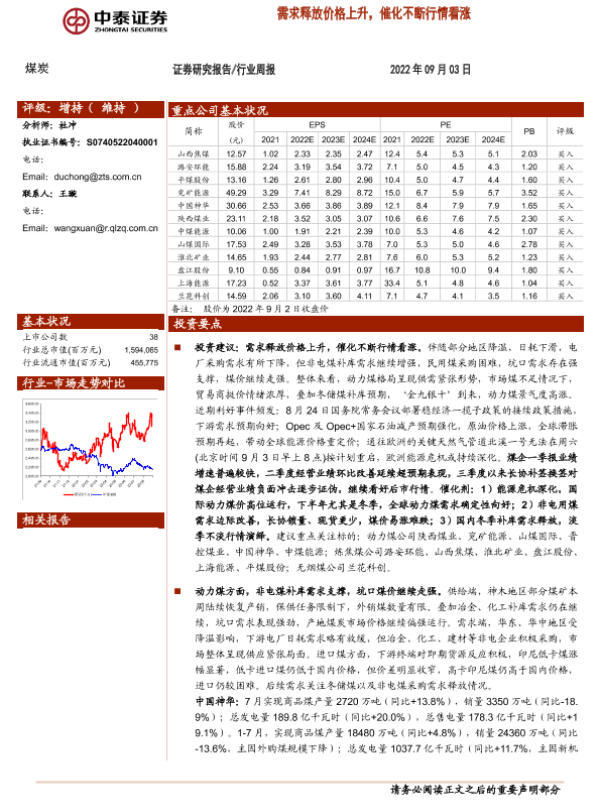 【中泰证券】【20220903】20220903-中泰证券-煤炭行业周报:需求释放价格上升,催化不断行情看涨-24页