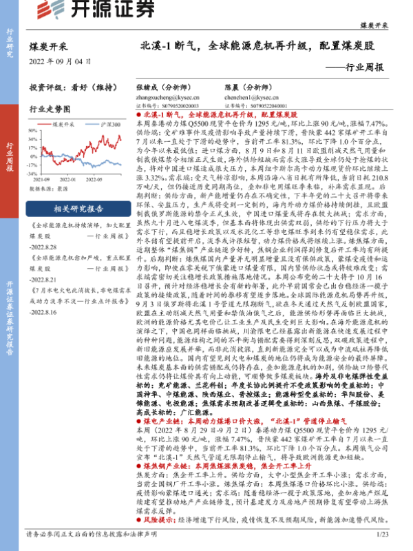【开源证券】【20220904】煤炭开采行业周报:北溪-1断气,全球能源危机再升级,配置煤炭股-23页