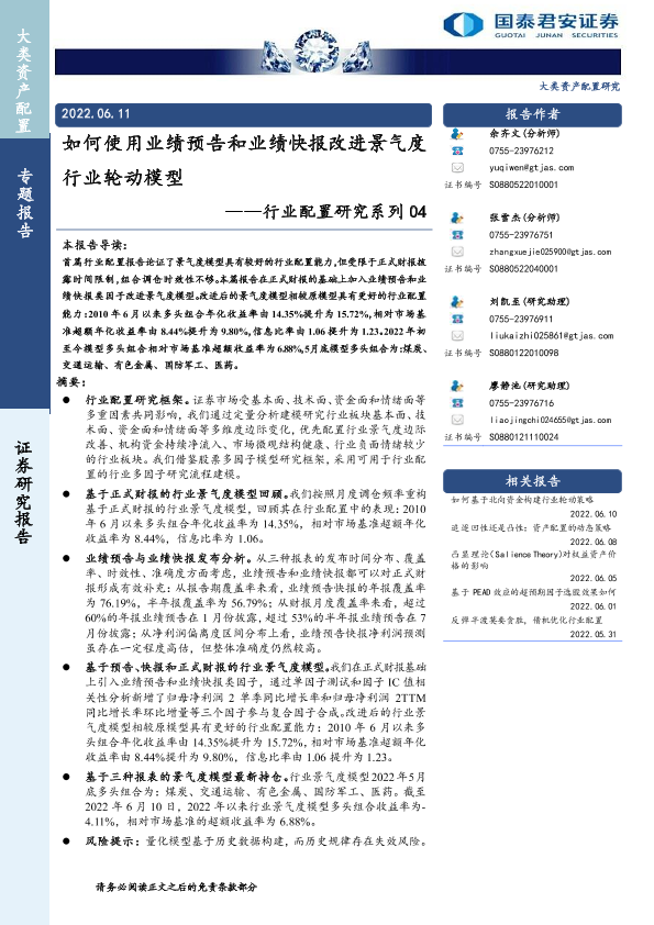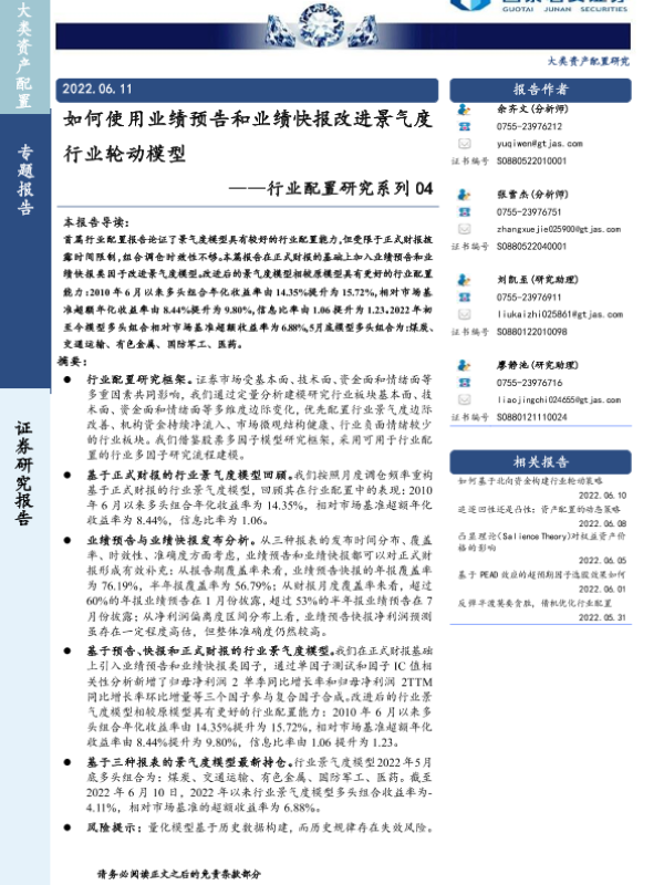 【国泰君安证券】【20220611】如何使用业绩预告和业绩快报改进景气度行业轮动模型-30页