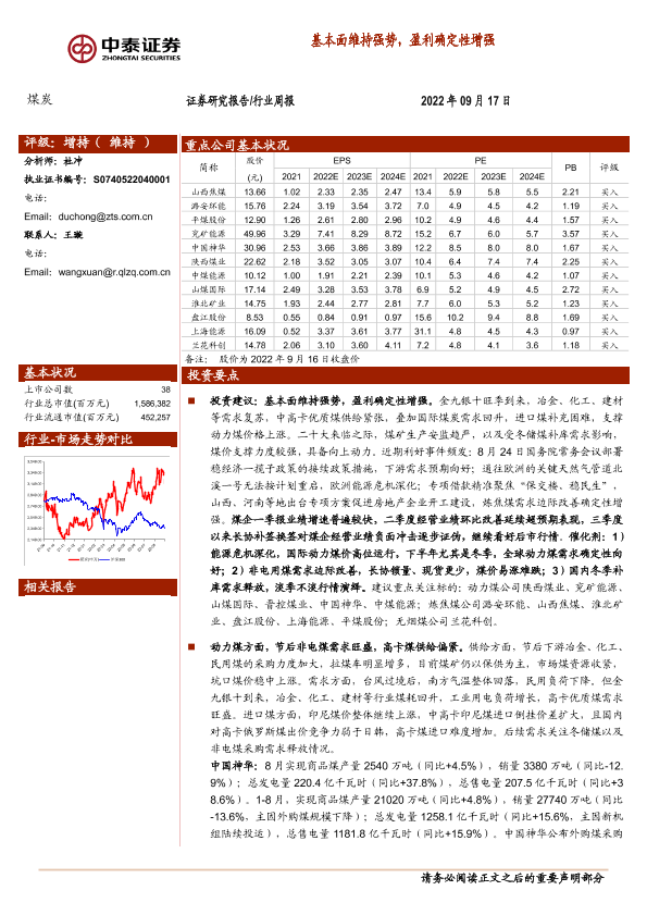 【中泰证券】【20220917】20220917-中泰证券-煤炭行业周报:基本面维持强势,盈利确定性增强-24页