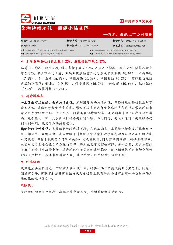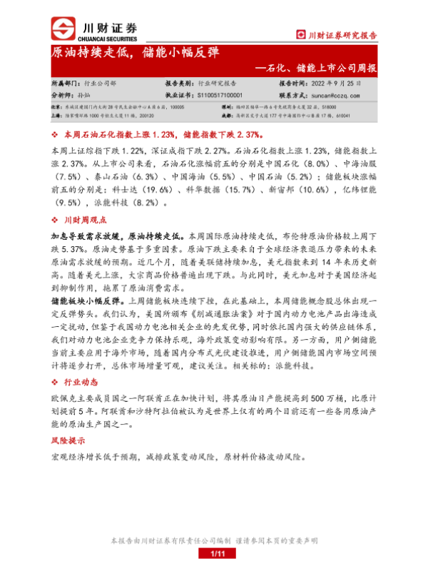【川财证券】【20220925】20220925-川财证券-石化、储能上市公司周报:原油持续走低,储能小幅反弹-11页