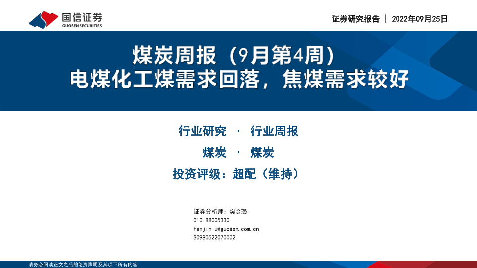 【国信证券】【20220925】20220925-国信证券-煤炭行业周报(9月第4周):电煤化工煤需求回落,焦煤需求较好-28页