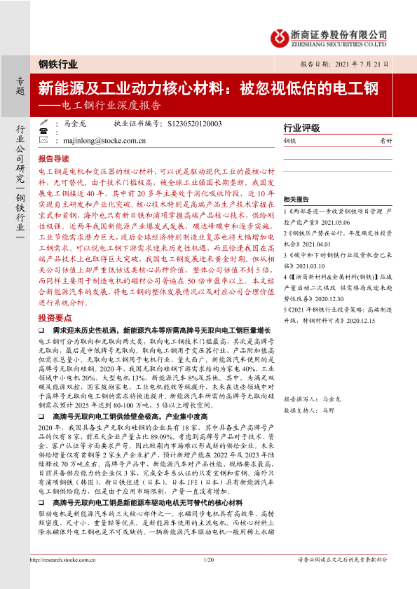【浙商证券】【20210721】电工钢行业深度报告:新能源及工业动力核心材料,被忽视低估的电工钢-20页
