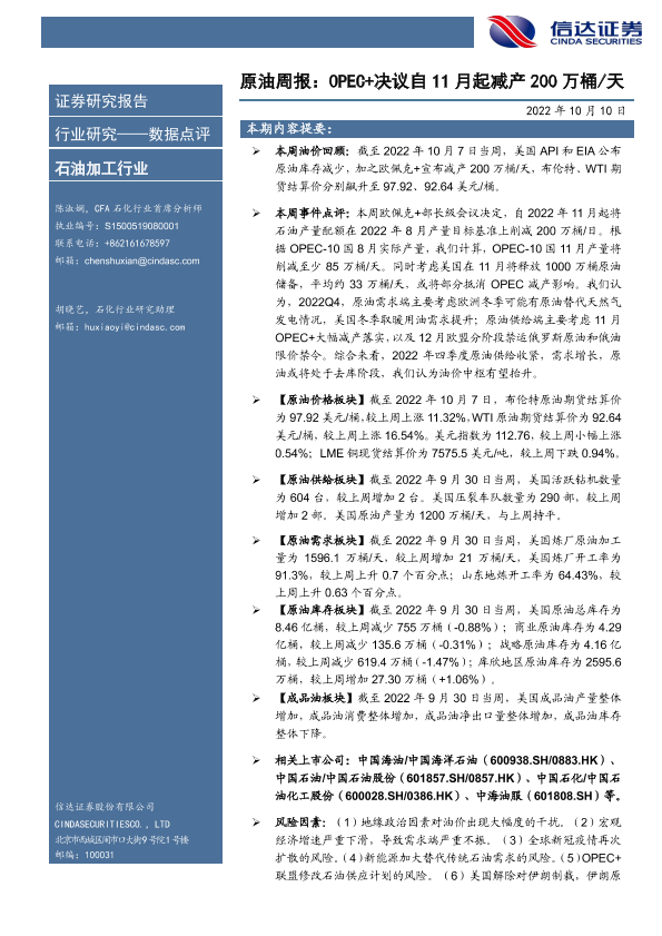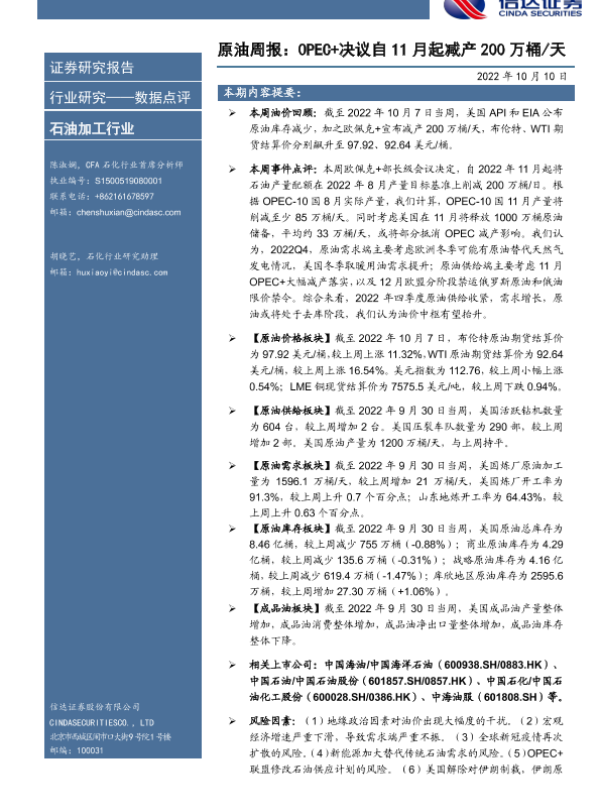 【信达证券】【20221010】原油周报:OPEC+决议自11月起减产200万桶/天-20页
