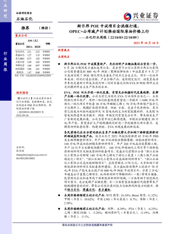 【兴业证券】【20221010】20221010-兴业证券-石化行业周报:斯尔邦POE中试项目全流程打通,OPEC+公布减产计划推动国际原油价格上行-16页