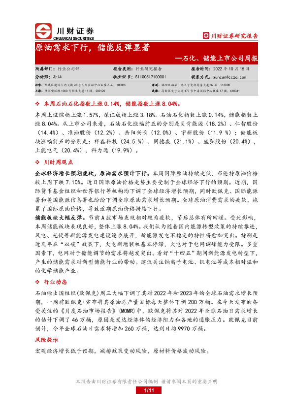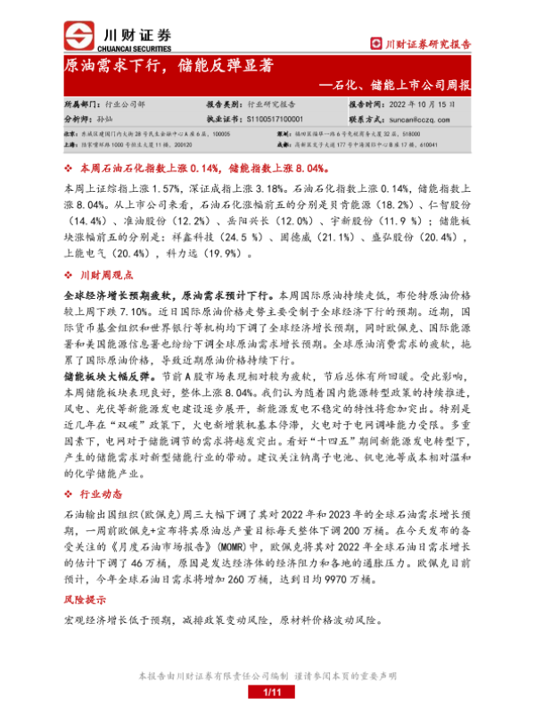 【川财证券】【20221015】20221015-川财证券-石化、储能上市公司周报:原油需求下行,储能反弹显著-11页