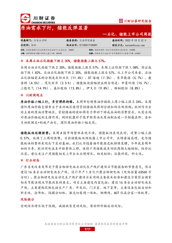 【川财证券】【20221022】20221022-川财证券-石化、储能上市公司周报:原油需求下行,储能反弹显著-11页