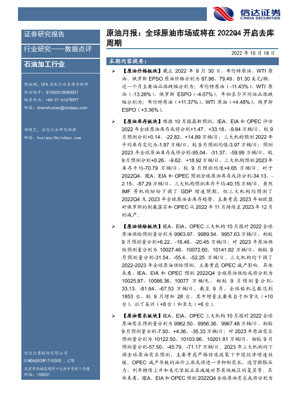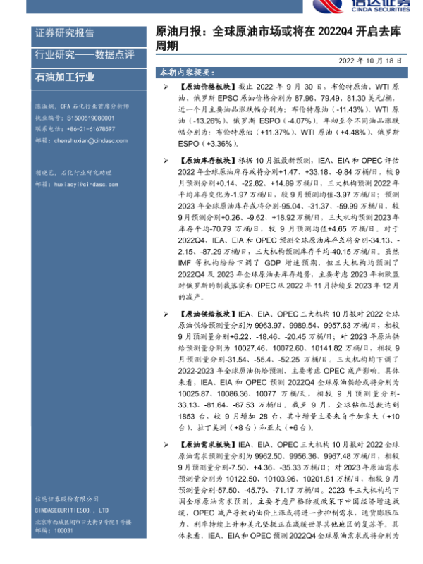 【信达证券】【20221018】原油月报:全球原油市场或将在2022Q4开启去库周期-20页