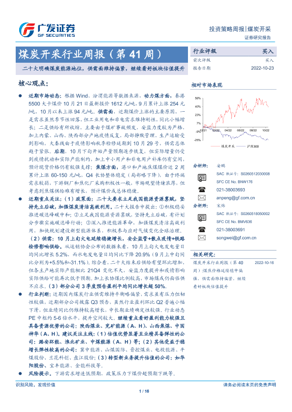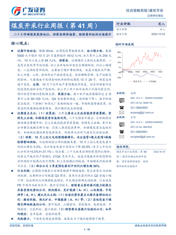 【广发证券】【20221023】20221023-广发证券-煤炭开采行业周报(第41周):二十大明确煤炭能源地位,供需面维持偏紧,继续看好板块估值提升-16页