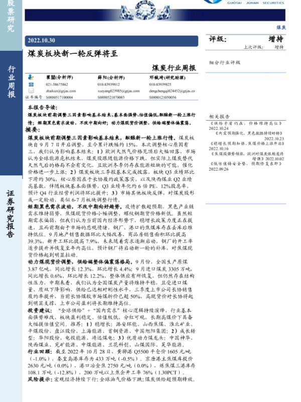 【国泰君安证券】【20221030】20221030-国泰君安-煤炭行业周报:煤炭板块新一轮反弹将至-30页