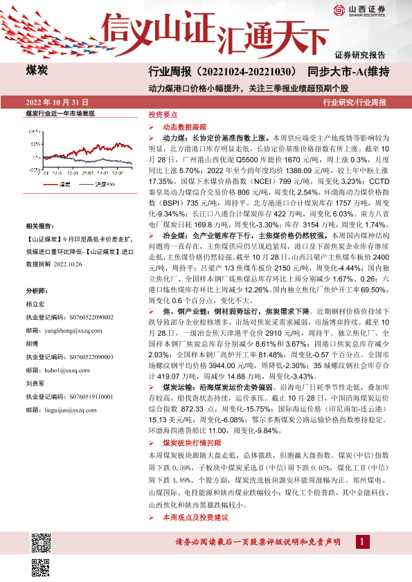 【山西证券】【20221031】煤炭行业周报:动力煤港口价格小幅提升,关注三季报业绩超预期个股-19页