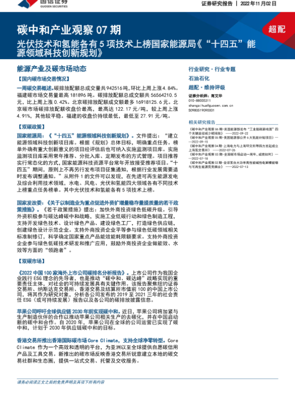 【国信证券】【20221102】20221102-国信证券-碳中和产业观察07期:光伏技术和氢能各有5项技术上榜国家能源局《“十四五”能源领域科技创新规划》-23页