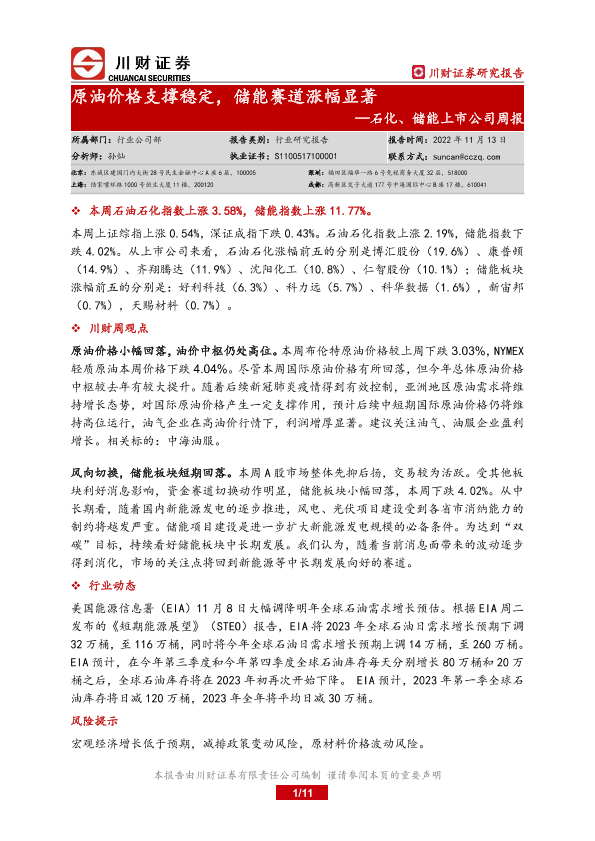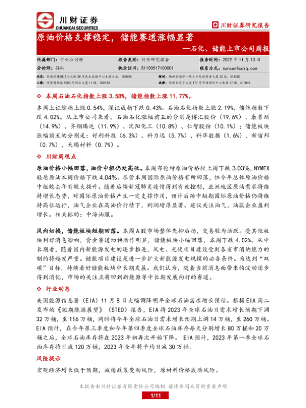 【川财证券】【20221113】20221113-川财证券-石化、储能上市公司周报:原油价格支撑稳定,储能赛道涨幅显著-11页