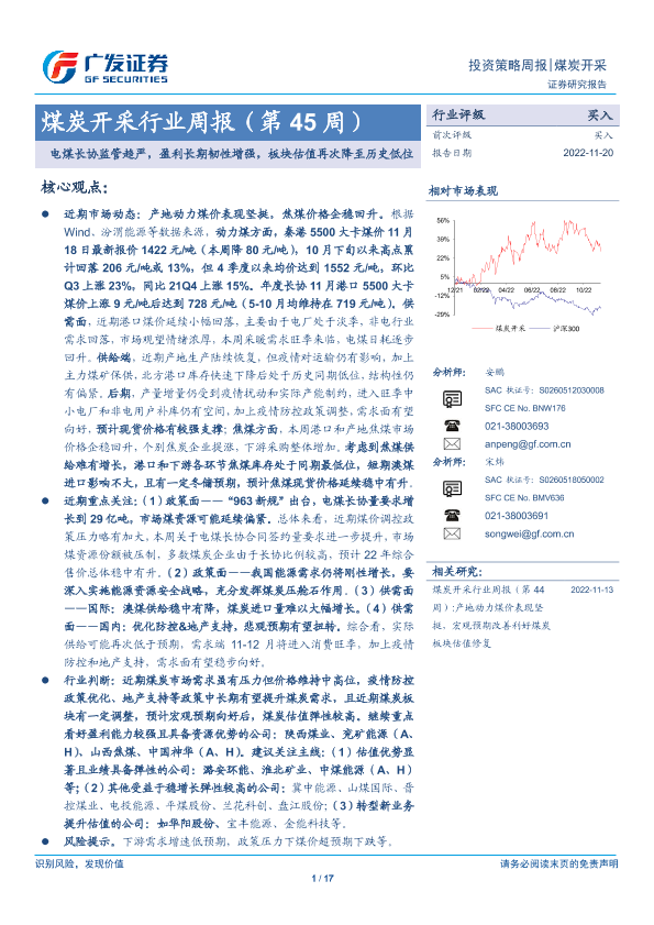 【广发证券】【20221120】20221120-广发证券-煤炭开采行业周报(第45周):电煤长协监管趋严,盈利长期韧性增强,板块估值再次降至历史低位-17页