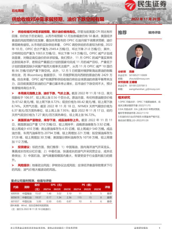 【民生证券】【20221120】石化周报:供给收缩对冲需求弱预期,油价下跌空间有限-26页