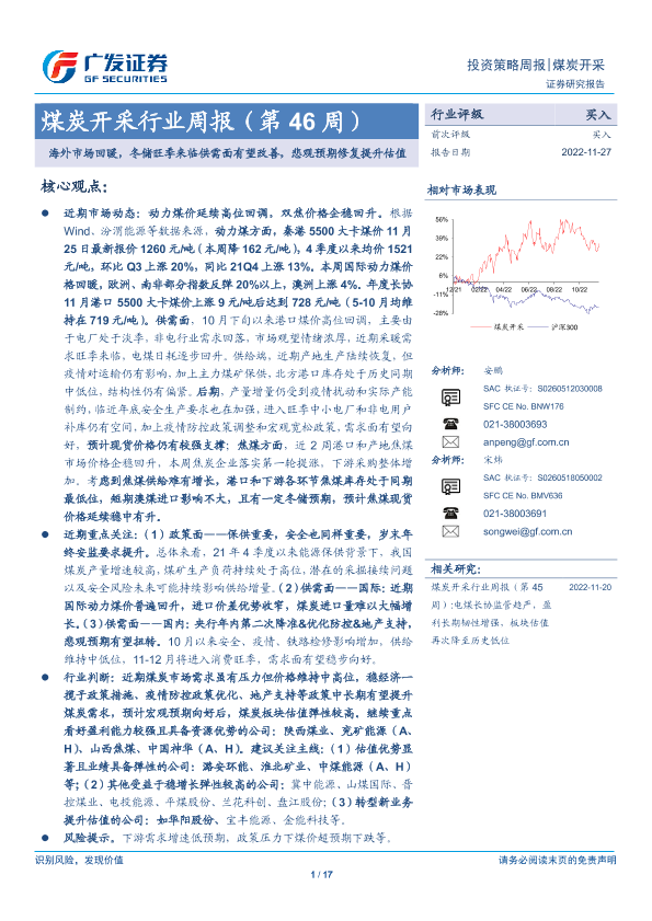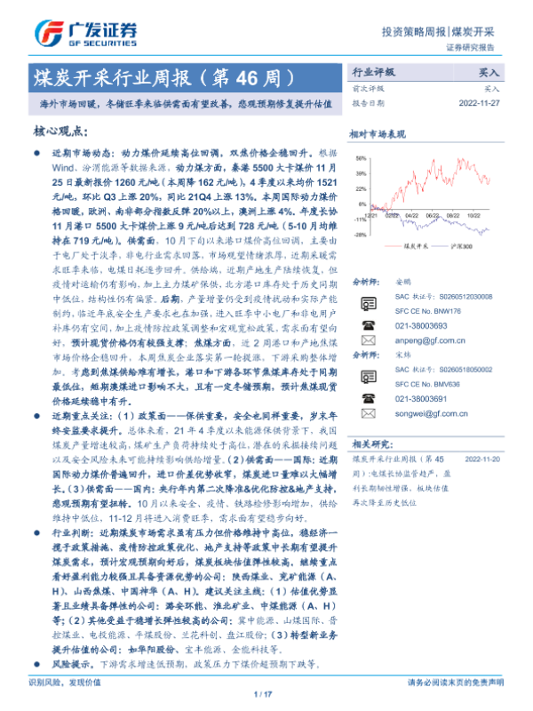 【广发证券】【20221127】20221127-广发证券-煤炭开采行业周报(第46周):海外市场回暖,冬储旺季来临供需面有望改善,悲观预期修复提升估值-17页
