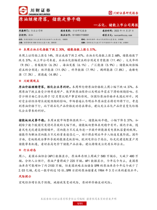 【川财证券】【20221127】20221127-川财证券-石化、储能上市公司周报:原油继续滑落,储能走势平稳-11页
