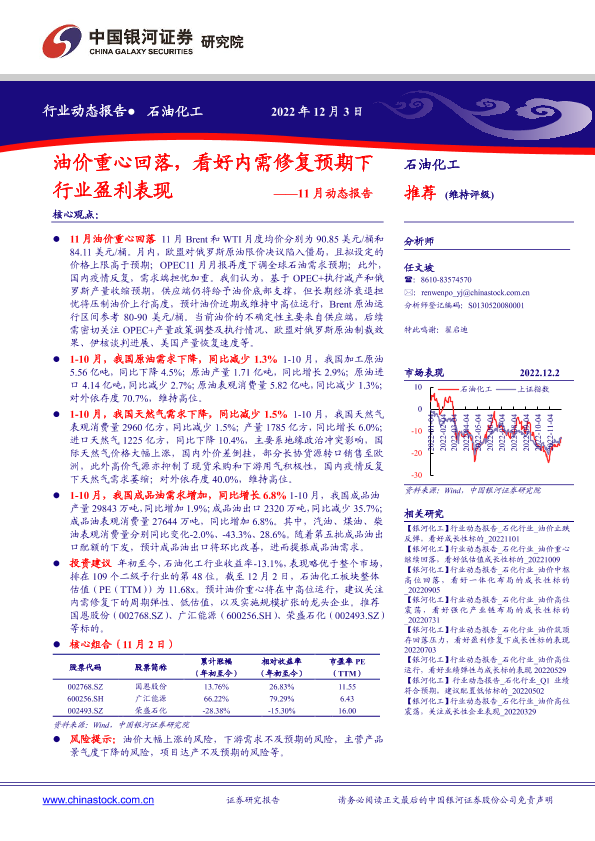 【银河证券】【20221203】20221203-中国银河-石油化工11月动态报告:油价重心回落,看好内需修复预期下行业盈利表现-25页