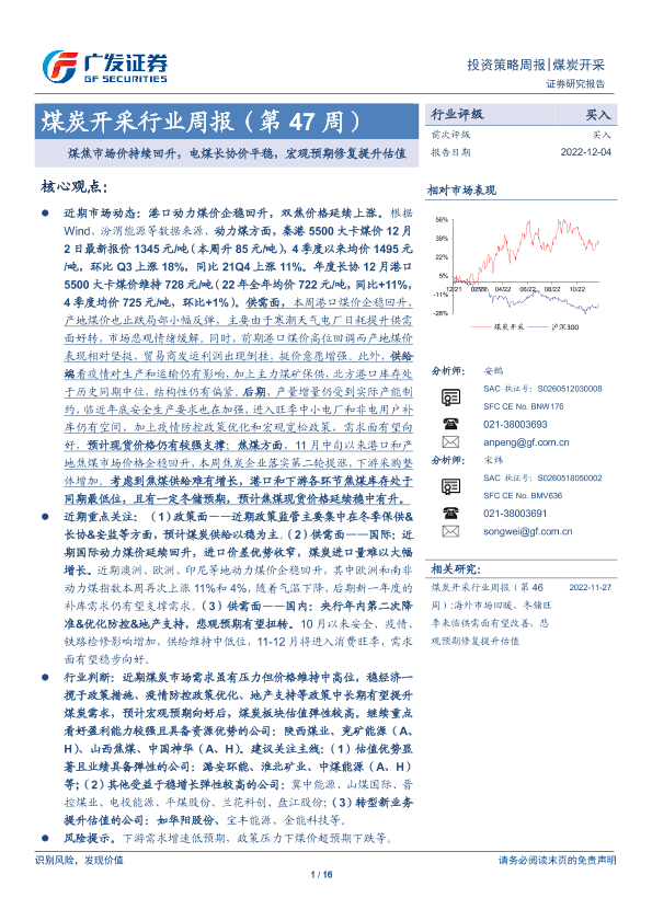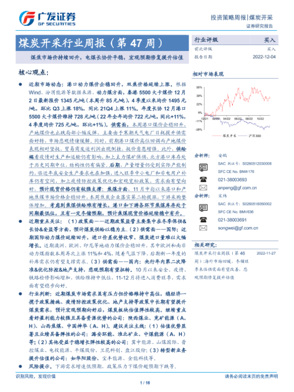 【广发证券】【20221204】20221204-广发证券-煤炭开采行业周报(第47周):煤焦市场价持续回升,电煤长协价平稳,宏观预期修复提升估值-16页