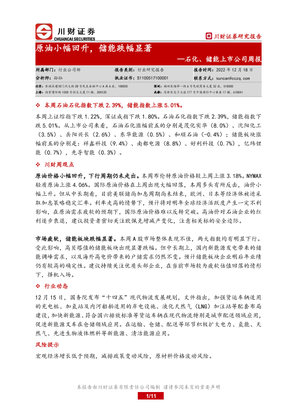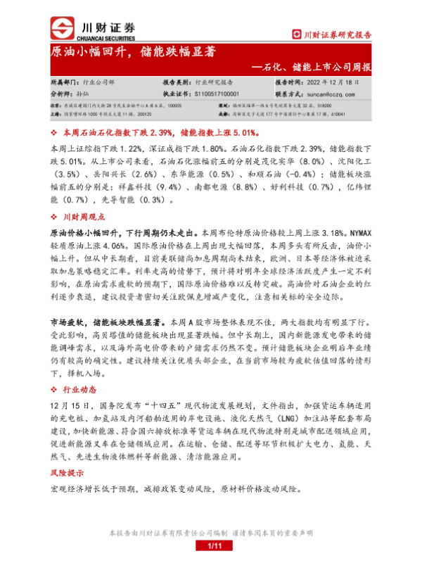 【川财证券】【20221218】20221218-川财证券-石化、储能上市公司周报:原油小幅回升,储能跌幅显著-11页