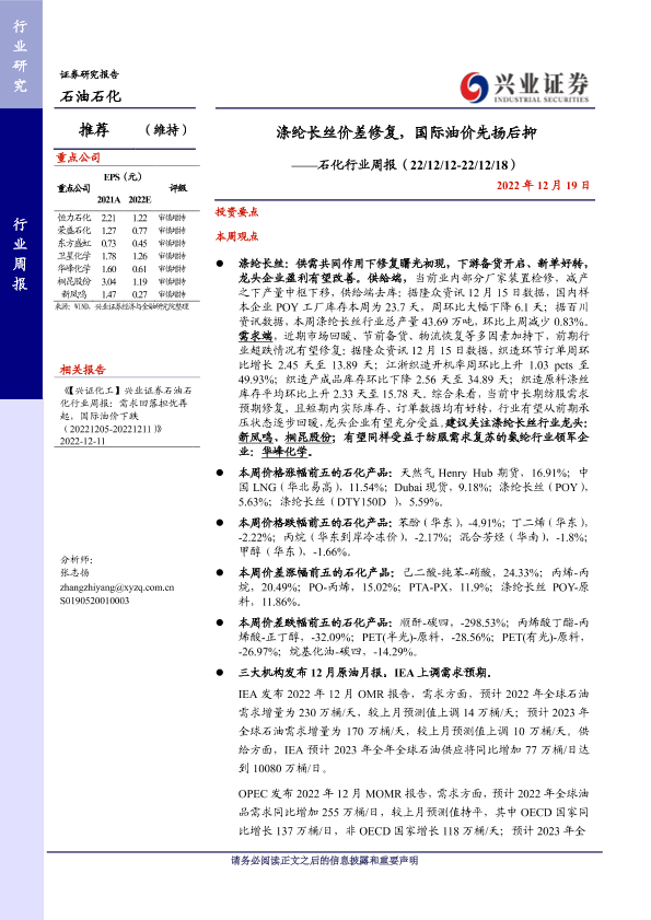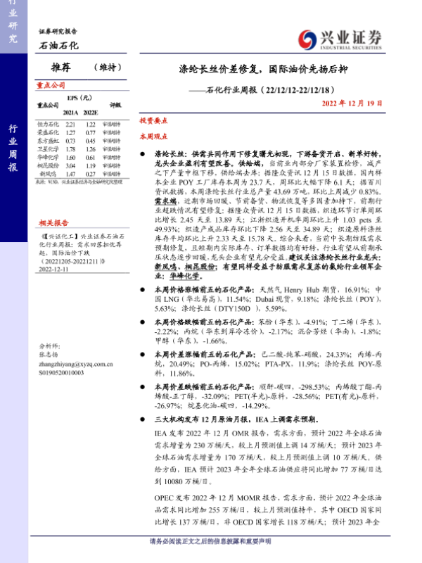 【兴业证券】【20221219】石化行业周报:涤纶长丝价差修复,国际油价先扬后抑-17页