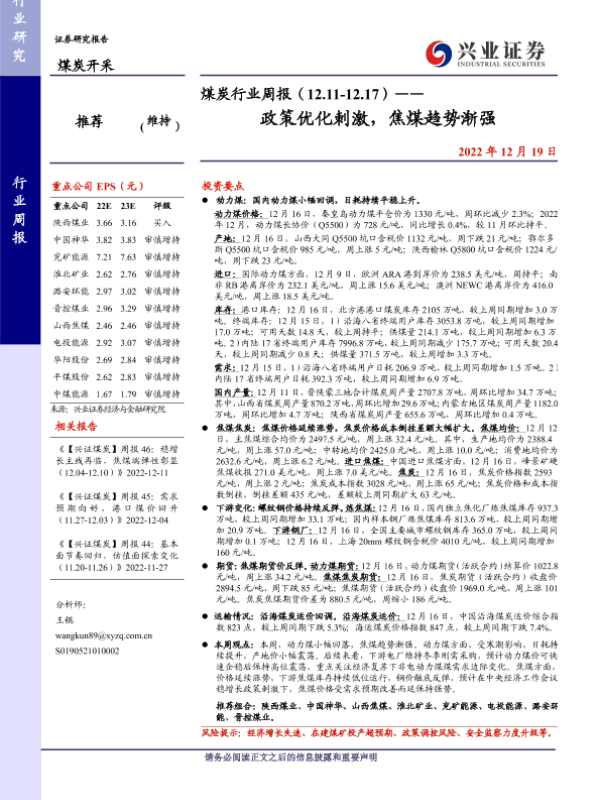 【兴业证券】【20221219】20221219-兴业证券-煤炭行业周报:政策优化刺激,焦煤趋势渐强-12页
