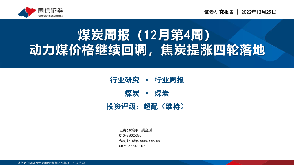 【国信证券】【20221225】20221225-国信证券-煤炭周报(12月第4周):动力煤价格继续回调,焦炭提涨四轮落地-28页