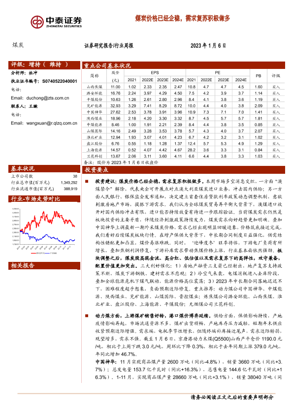 【中泰证券】【20230106】20230106-中泰证券-煤炭行业周报:煤炭价格已经企稳,需求复苏积极做多-27页