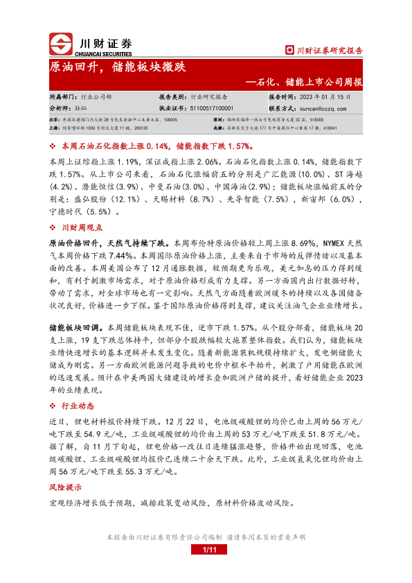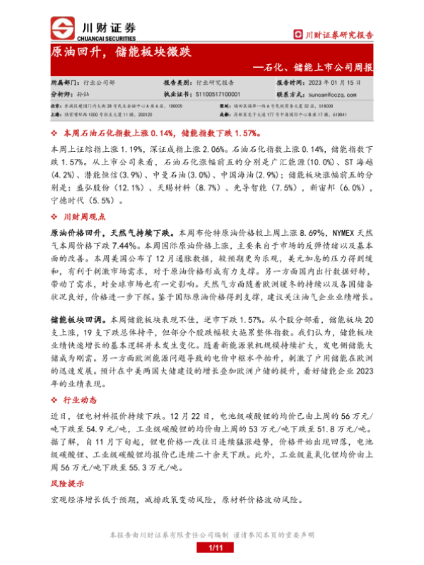 【川财证券】【20230115】20230115-川财证券-石化、储能上市公司周报:原油回升,储能板块微跌-11页