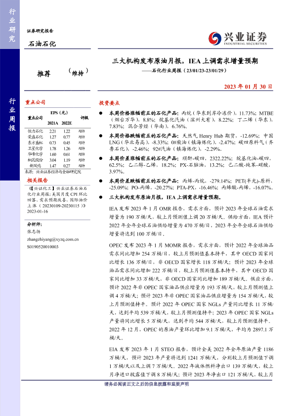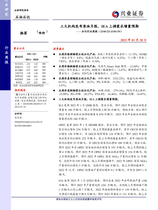 【兴业证券】【20230130】20230130-兴业证券-石化行业周报:三大机构发布原油月报,IEA上调需求增量预期-17页