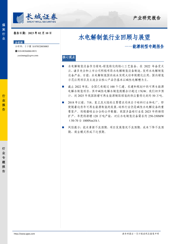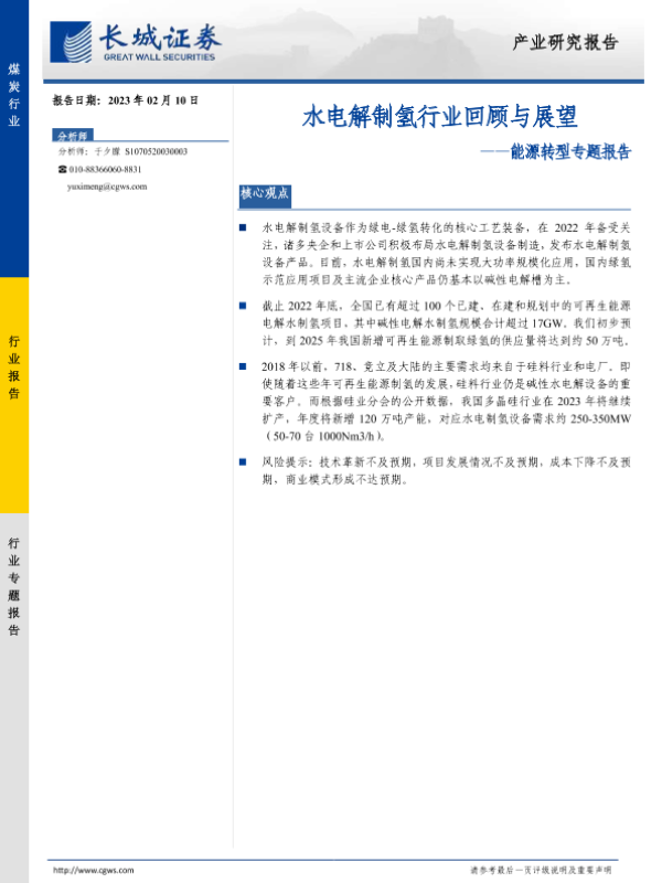 【长城证券】【20230210】煤炭:能源转型专题报告-水电解制氢行业回顾与展望-10页