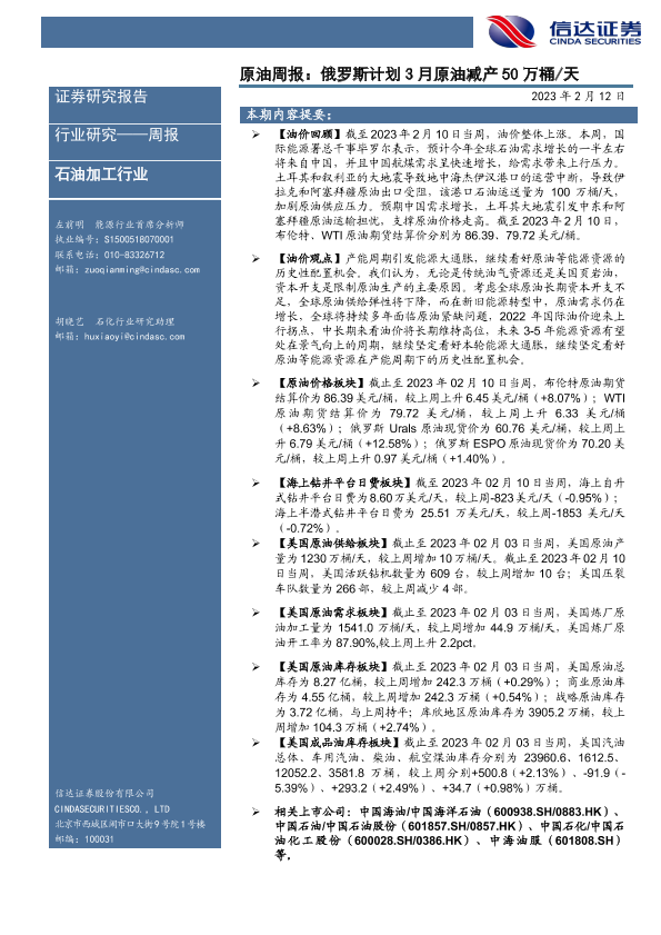 【信达证券】【20230212】原油周报:俄罗斯计划3月原油减产50万桶 天-26页