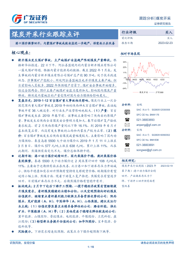【广发证券】【20230223】20230223-广发证券-煤炭开采行业跟踪点评:港口煤价强势回升,内蒙煤矿事故或致安监进一步趋严,供需面正在改善-15页