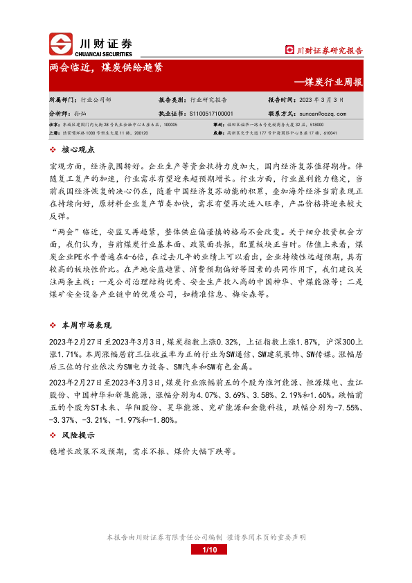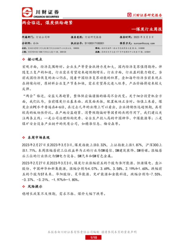 【川财证券】【20230303】20230303-川财证券-煤炭行业周报:两会临近,煤炭供给趋紧-10页