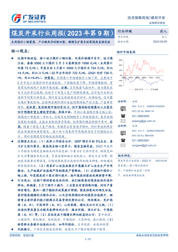【广发证券】【20230305】2023年第9期煤炭开采行业周报:本周煤价小幅震荡,产业链库存延续回落,稳增长扩需求政策煤炭直接受益-17页
