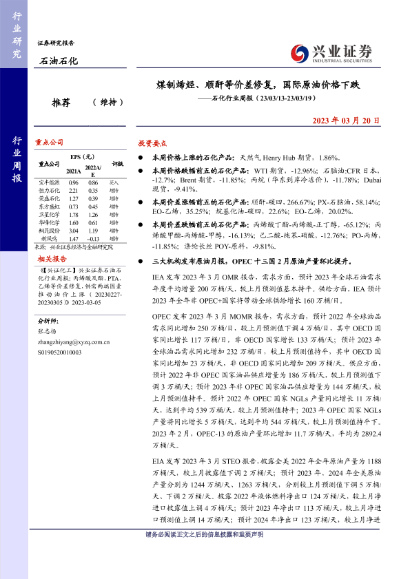 【兴业证券】【20230320】煤制烯烃、顺酐等价差修复,国际原油价格下跌——石化行业周报(23/03/13-23/03/19)-17页